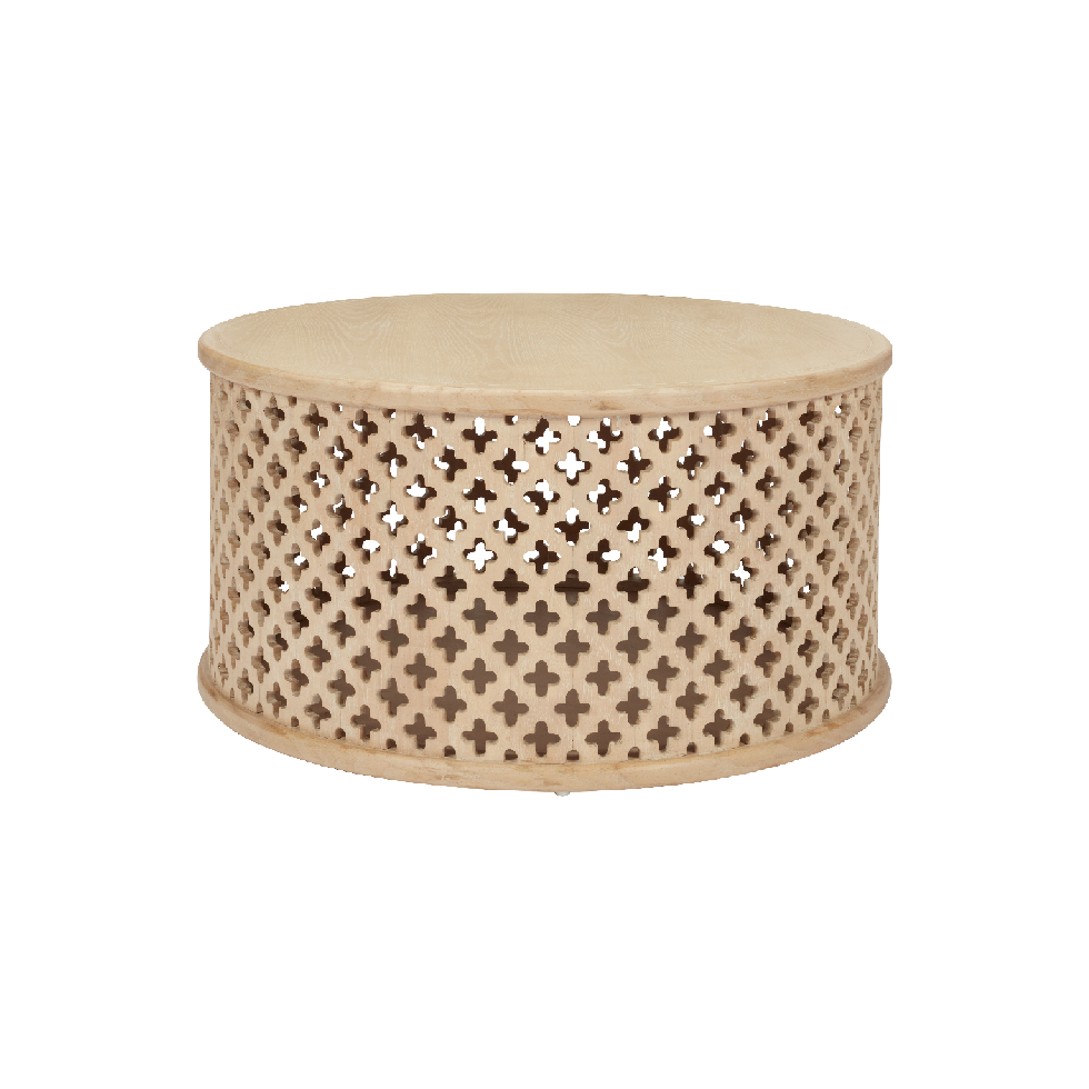 The Medina Coffee Table will add style and texture to your lounge space. Crafted from natural wood, this drum-shaped table features an intricate Bohemian-style cut out pattern. Anchor your next lounge with this beautiful piece.