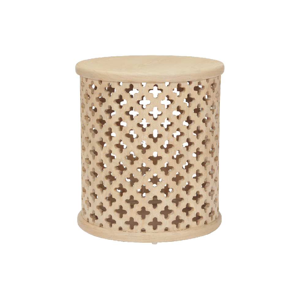 The Medina End Table will add style and texture to your lounge space. Crafted from natural wood, this drum-shaped table features an intricate Bohemian-style cut out pattern. Anchor your next lounge with this beautiful piece.