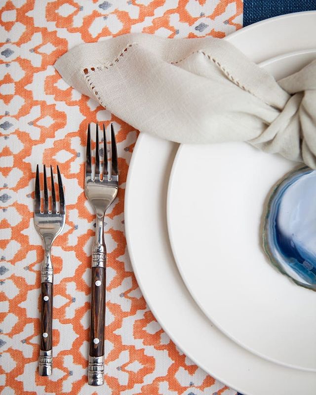 The Athena Stoneware & Rosewood Flatware perfectly pair with the Milagro Orange Linen!, created_time