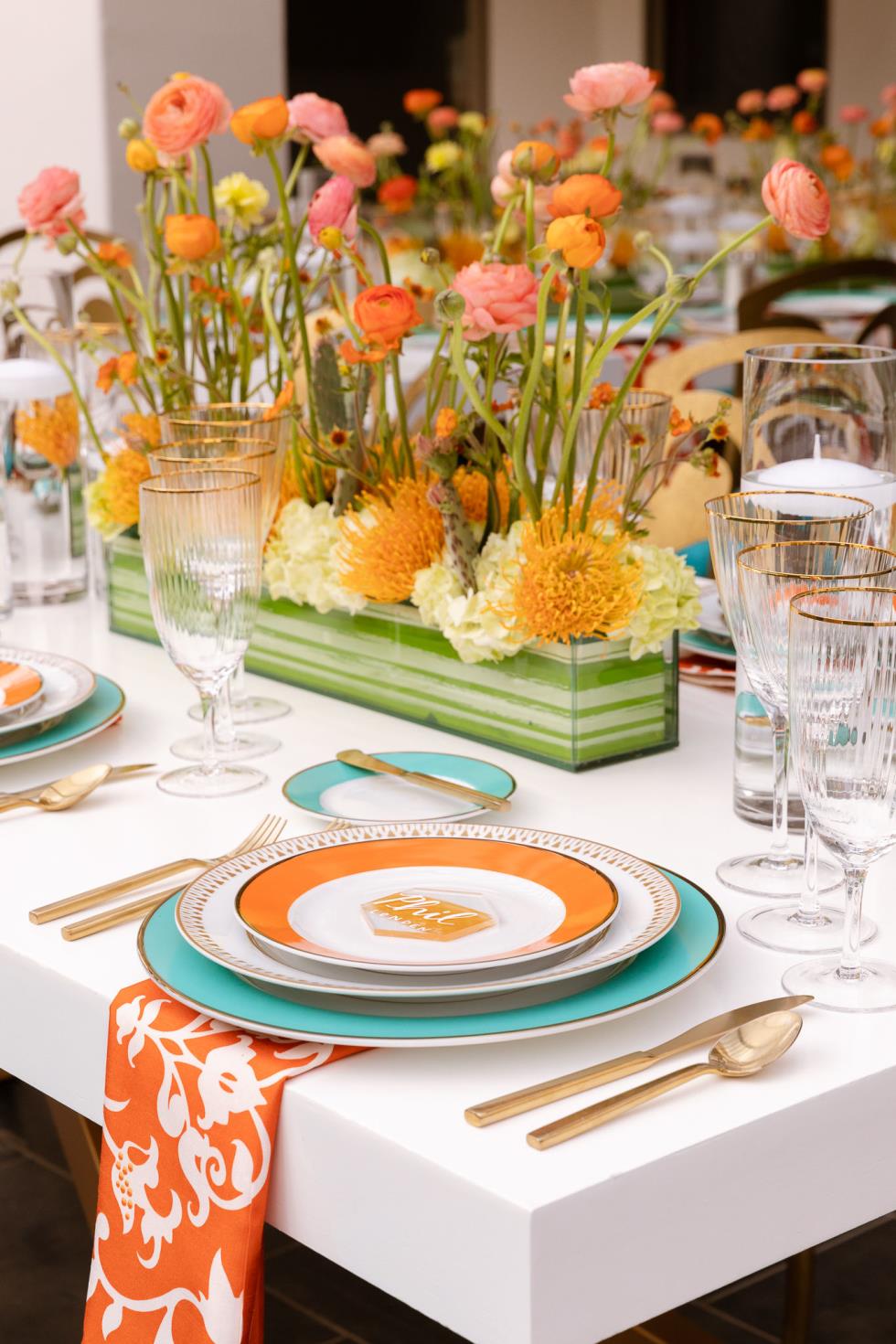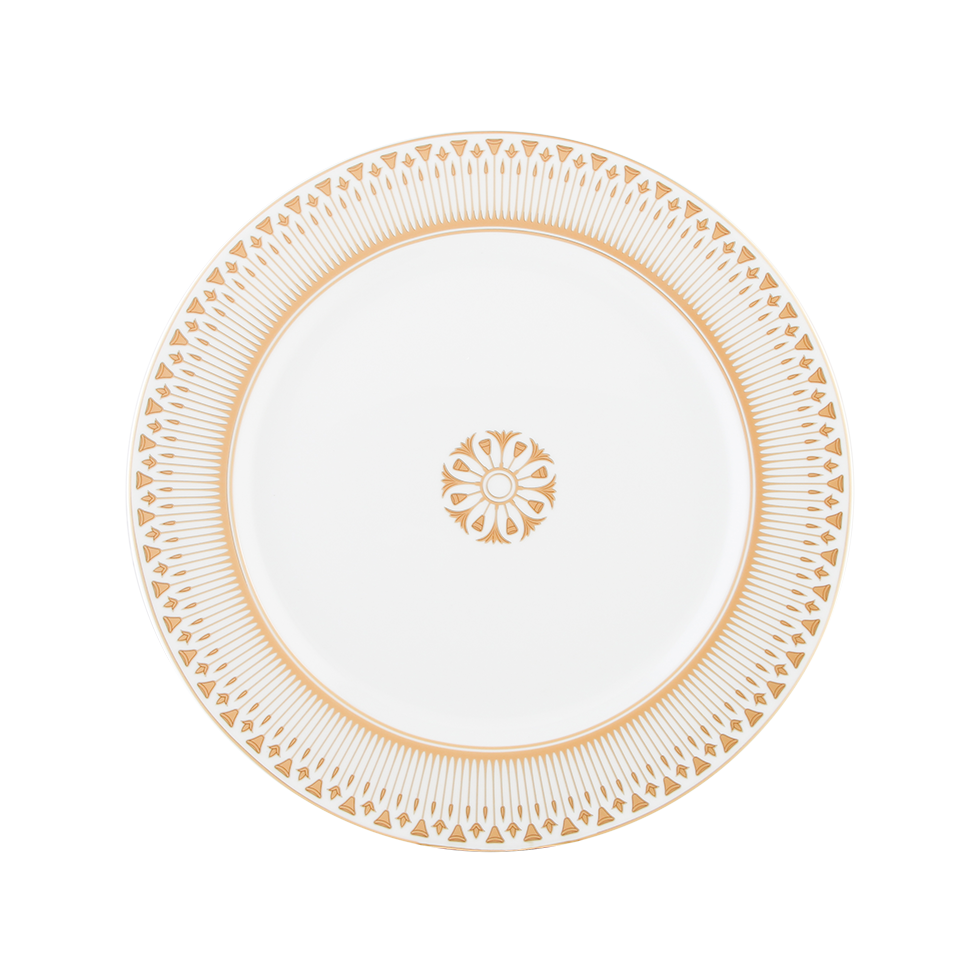 Egyptian inspired architectural design is mixed with a flowering papyrus motif creating a delicate and sophisticated border. Highlight your table with a matching colorful chop plate or salad/dessert plate in sage, chocolate, lilac, orange or violet to create a setting as unique as your event.