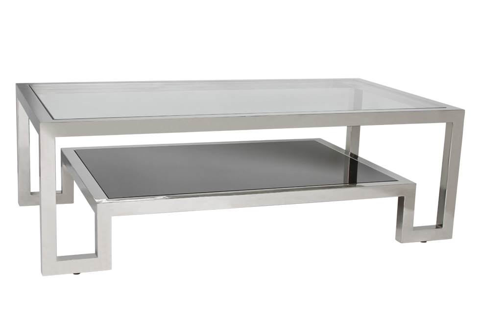 Contemporary coffee table is constructed of high quality stainless steel with a tempered clear glass top and black glass shelf.