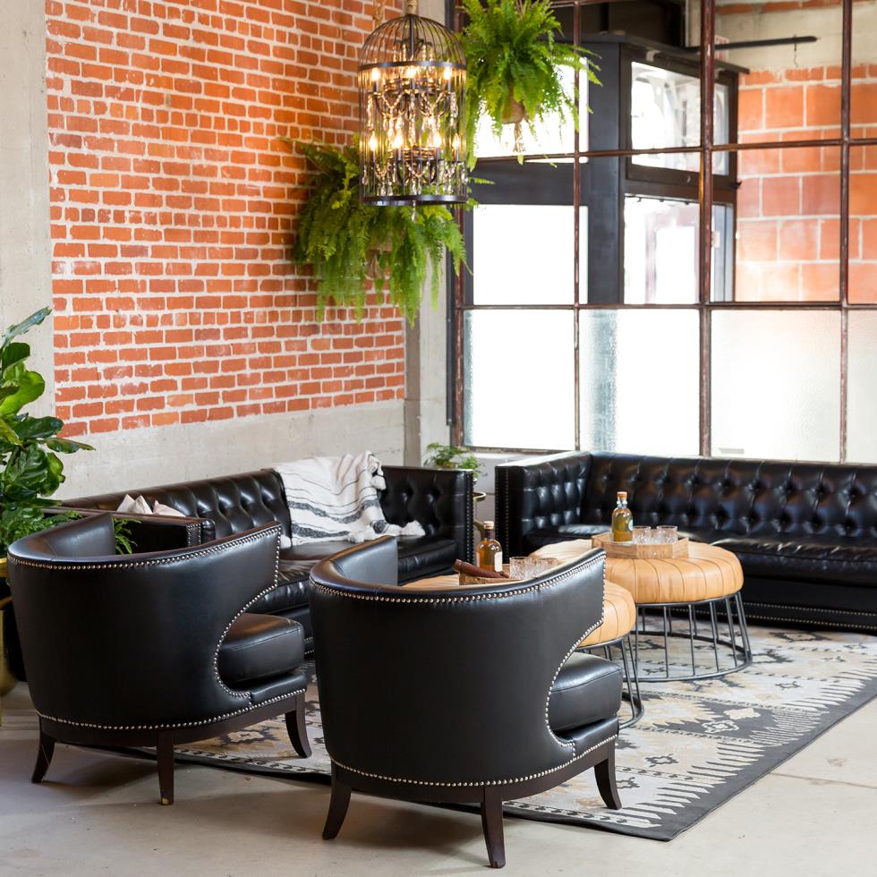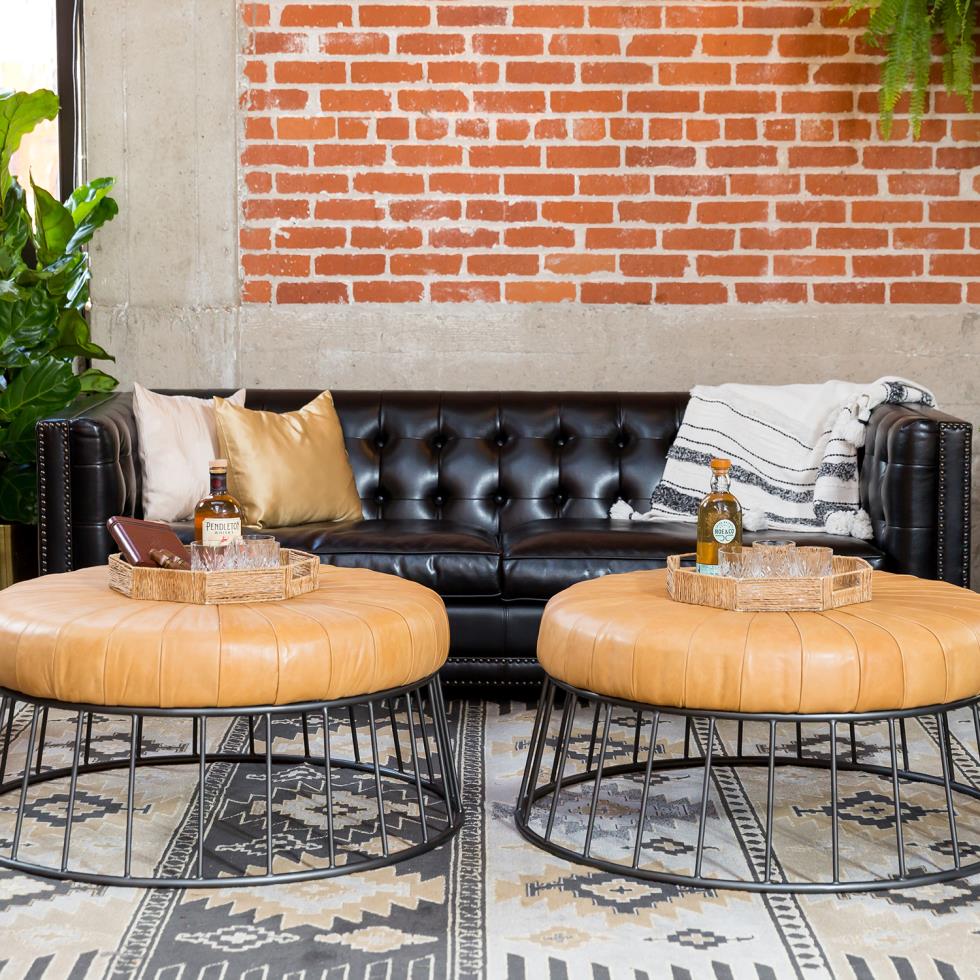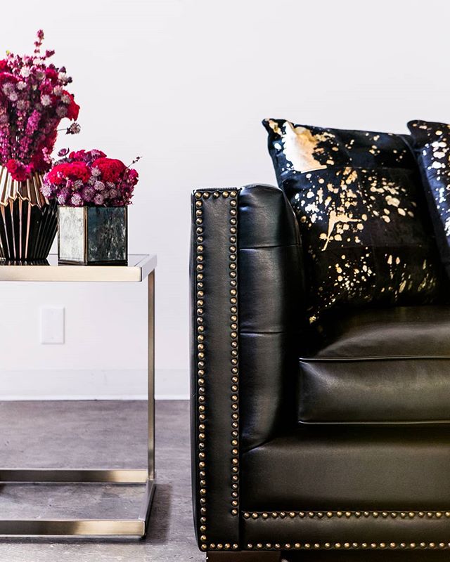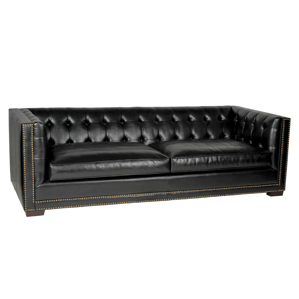 This impressive sofa marries traditional gold nailhead and deep button tufting with clean contemporary lines for a rich and refined look in black bonded leather.