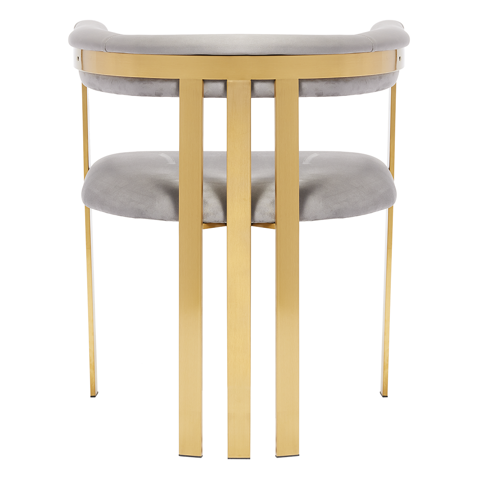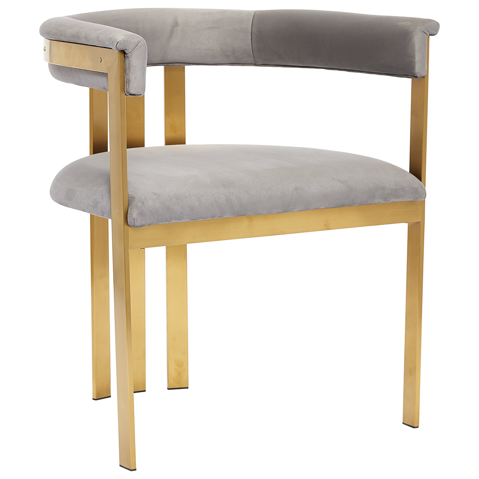 Introducing the Norman Chair: a versatile and elegant seating solution that effortlessly combines style and comfort. Whether you're designing a chic lounge, in need of an end chair for your dining table, or creating a sophisticated cocktail grouping, the Norman Chair is the perfect choice. Crafted with a ladder-back design and a sleek frame finished in brushed brass, this chair adds a touch of modern sophistication to any setting. Its plush seat and backrest, upholstered in luxurious platinum suede, provide unparalleled comfort, making the Norman Chair the ideal addition to elevate your next event or dining experience.