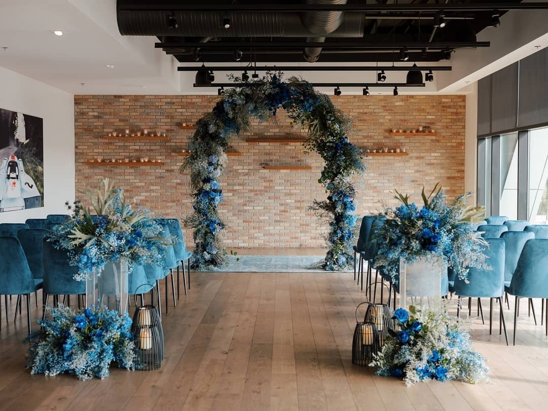 Mix and mingle in AQUA. Our Grey Wash Starburst Table with Black Legs is the perfect piece for your poolside cocktail reception.