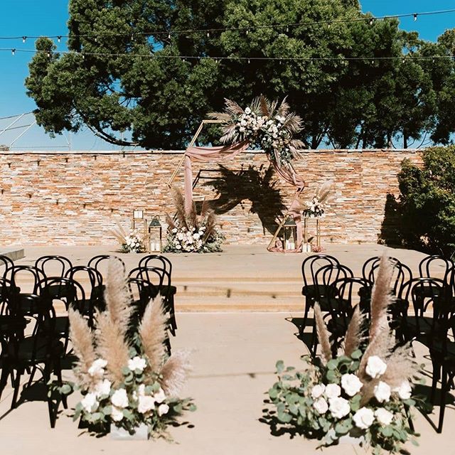 An edgy, boho ceremony setup with our Black Bentwood Chairs in the courtyard of @rosecentervenue.
