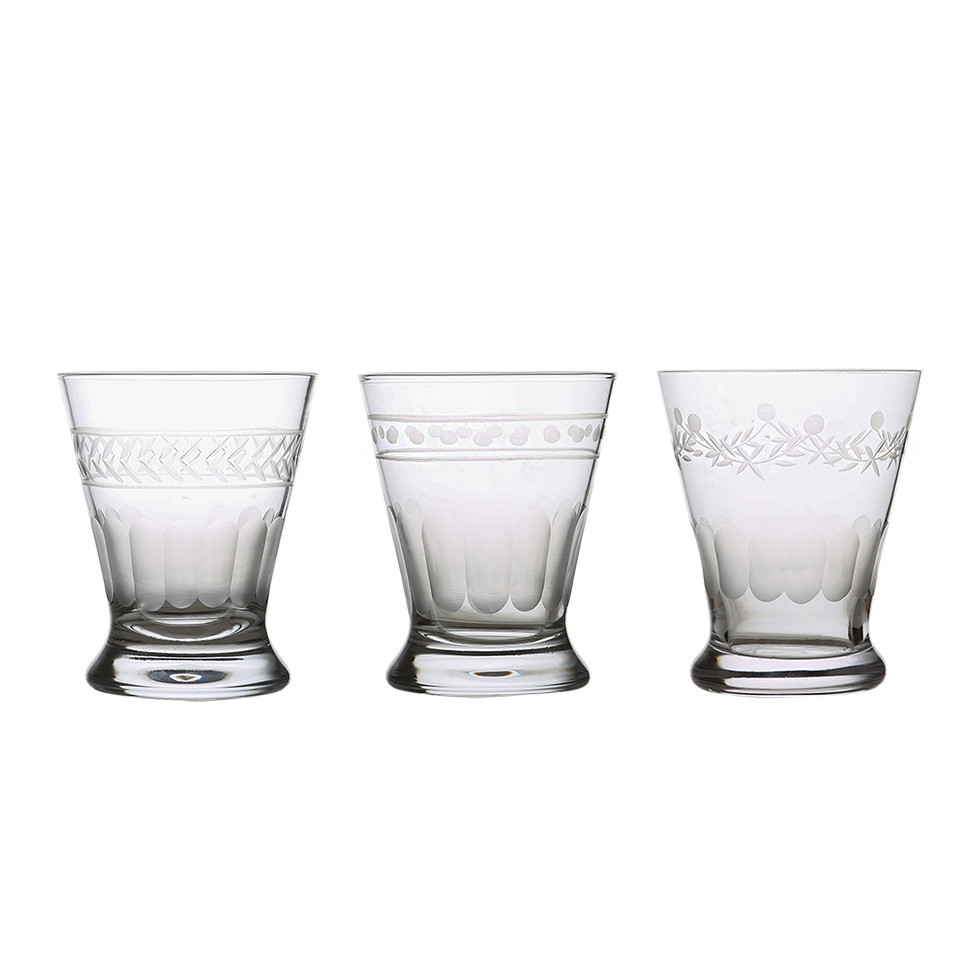 Timeless, etched, tumblers feature a Chevron, Dot or Leaf pattern reminiscent of a time gone by. Great for welcome beverages, as a water glass on the table, or serving refreshing, cold drinks like iced tea or lemonade. From formal to informal, these glasses go from bar to tabletop with ease.
