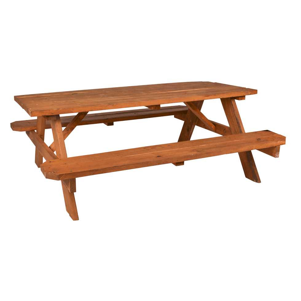 Solid wood picnic table with attached benches. Comfortably seats six guests. NOTE: Actual color of the table may vary from image shown. Please contact customer service for more details.