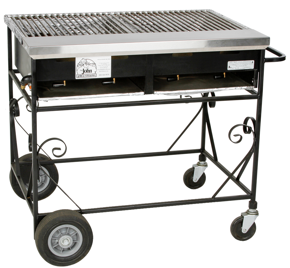 Outdoor 4 burner gas grill with cast iron grates. LP Gas, stainless steel fire box, each grill grate is independently controlled. One 30# LP tank will burn between 12 - 16 hours.