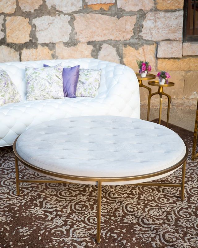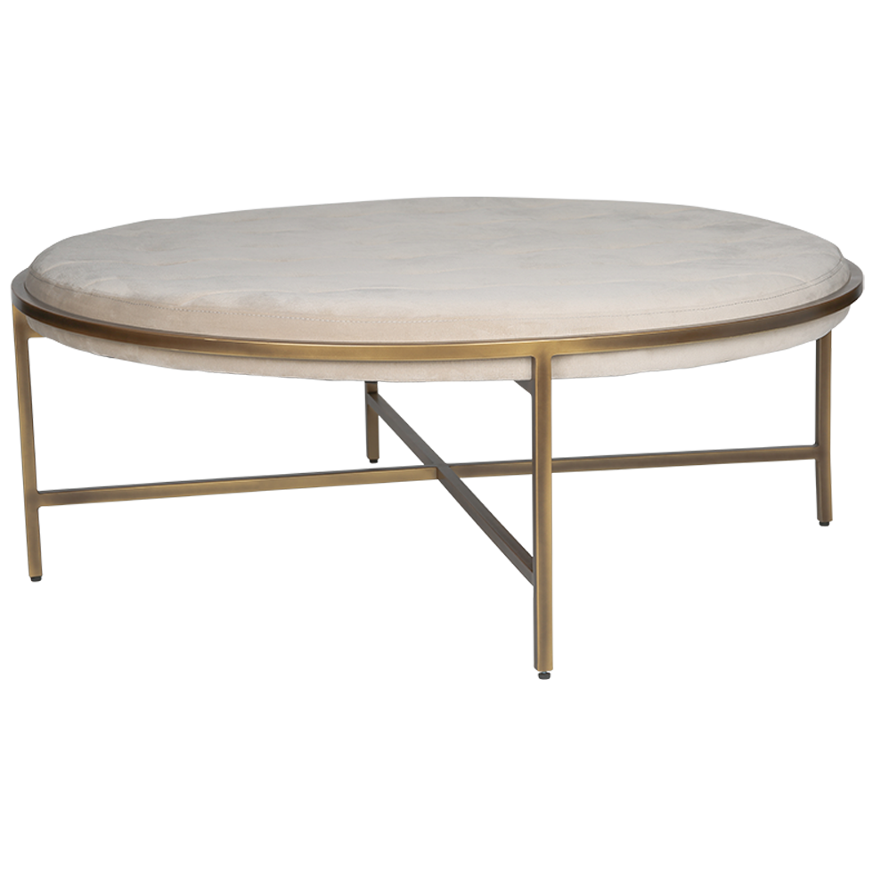 This large round ottoman exudes transitional flair. With a rustic bronze metal frame and tufted soft grey toned fabric, this ottoman can be used as a coffee table or as extra seating.