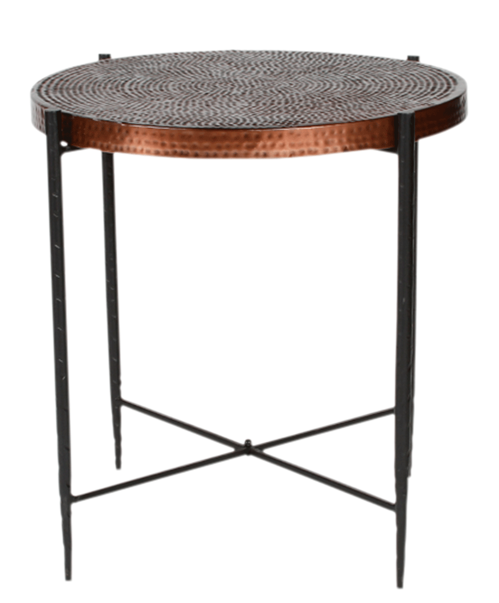 An exquisite, hammered copper lounge table featuring sleek, tailored black metal legs