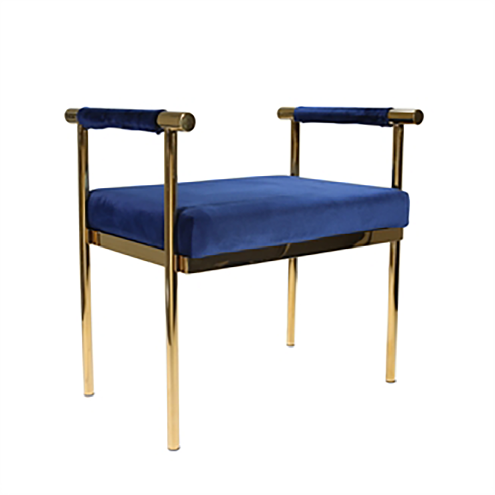 The Petit bench with handles is easy to place throughout your event space to provide elegant seating. The tubular metal frame gives the bench clean, well-defined lines. Don't underestimate this compact size bench with a thick seat cushion wrapped with sumptuous sapphire velveteen fabric and gold toned metal frame.