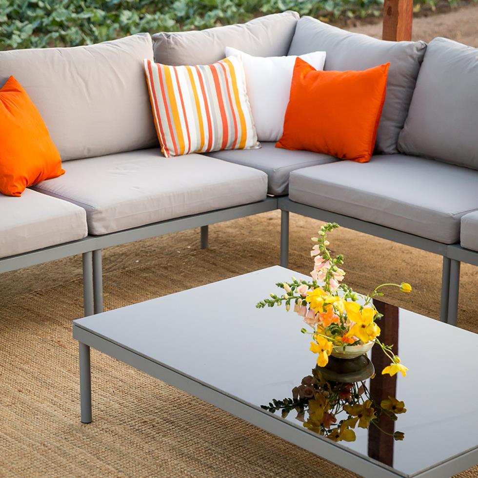 Durable lightweight aluminum frame. Powder-coated gray finish with granite-coated tempered glass. Complete set of lounge furniture to mix and match giving you the ability to create large conversation groups or cozy, personal spaces. Love seats, single seats, single ottoman, double ottoman, chaise, etc.