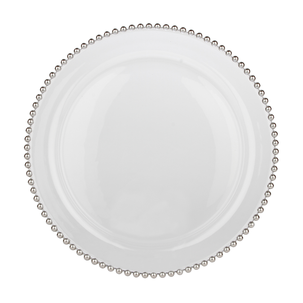 Delicate silver beading along the rim makes this clear glass charger plate a glamorous, glimmering accent for any table.