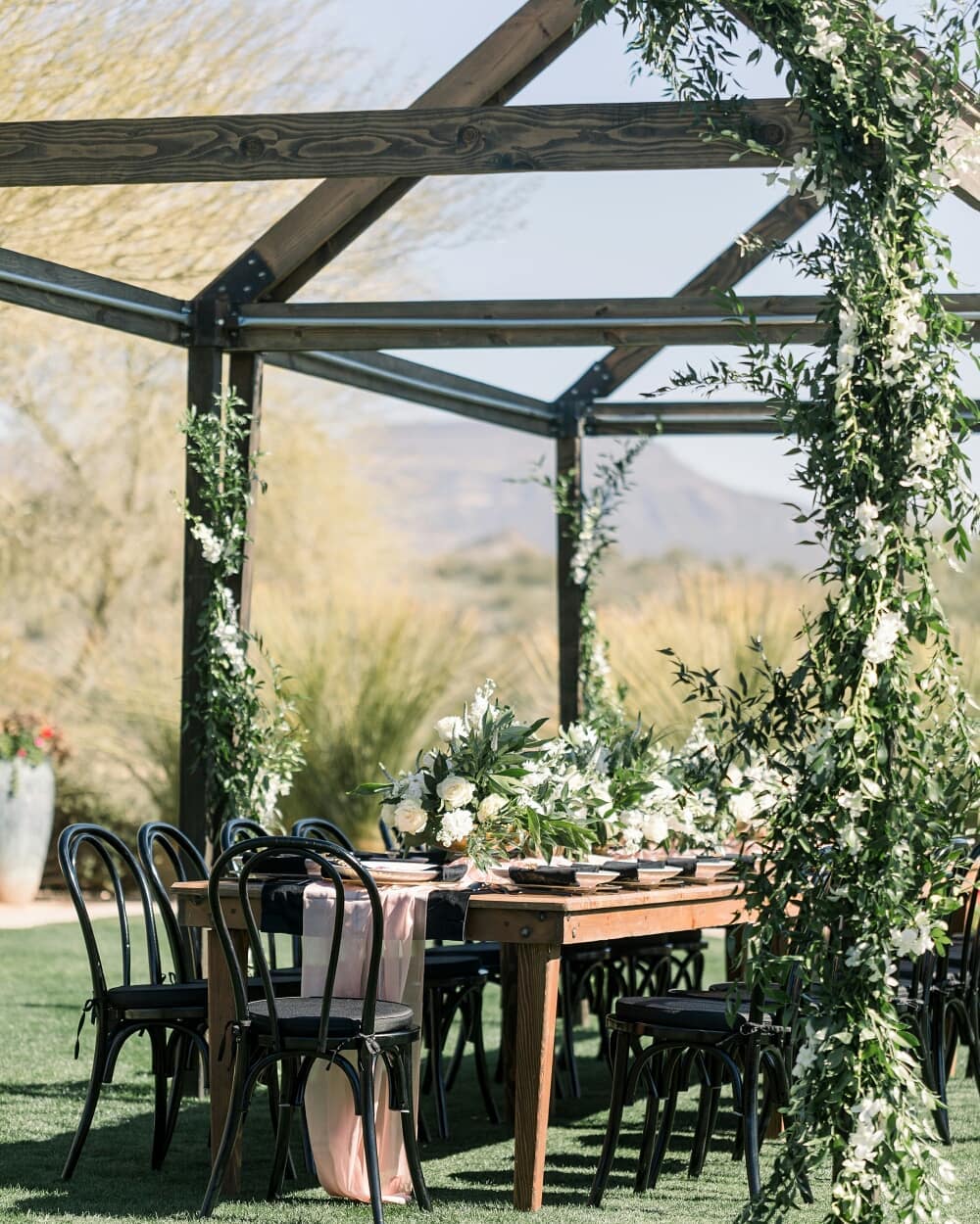 Gorgeous alfresco dining at Anthem Golf & Country Club with our Vineyard Frame House providing a beautiful focal point.