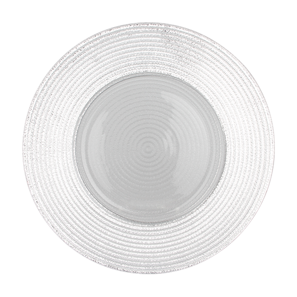 Concentric circles on a glitter glass charger suites a formal dinner party or informal get together with friends and family.