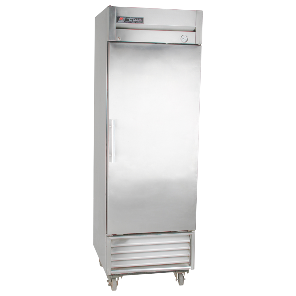 Reach-in, one-section, stainless steel door, stainless steel front, aluminum sides, clear coated aluminum interior with stainless steel floor, (3) adjustable PVC coated shelves, interior lighting, land leg levers.