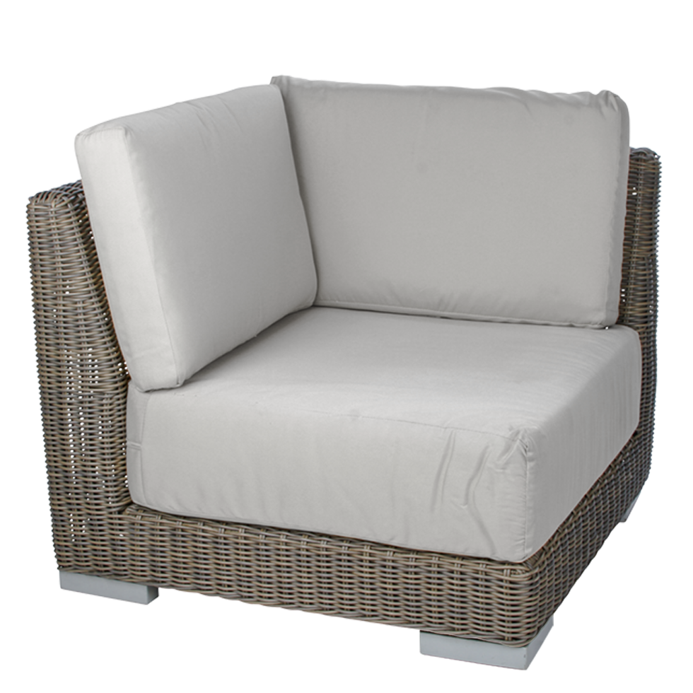 Create the perfect outdoor lounge area with our Sonoma Collection, including this corner chair, double chair with armrest, single chair and chaise. Simply sink in and relax with true deep seating featuring plush 5-inch thick cushions. Easily configure the ideal seating group by mixing and matching pieces for the perfect relaxation space. Add some accent tables, lanterns and toss accent pillows for an additional pop of color. Brown/Charcoal woven wicker over a strong aluminum frame.