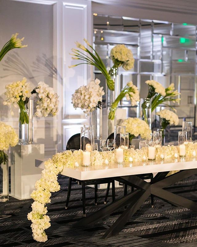 Our White Starburst Table with Black Legs fit right in at this black and white affair with an abundance of delicate florals and modern decor.
