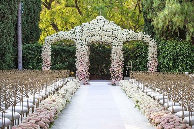 That ceremony arch!!! The Beverly Hills Hotel welcomes a beautiful blushing bride (and groom!) in this lush pink-to-white floral bridal aisle.