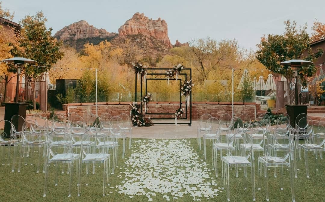 The creative BTS Managment team designed this striking outdoor ceremony utilizing our Galaxy Ghost Chairs to accentuate the stunning landscape beyond.