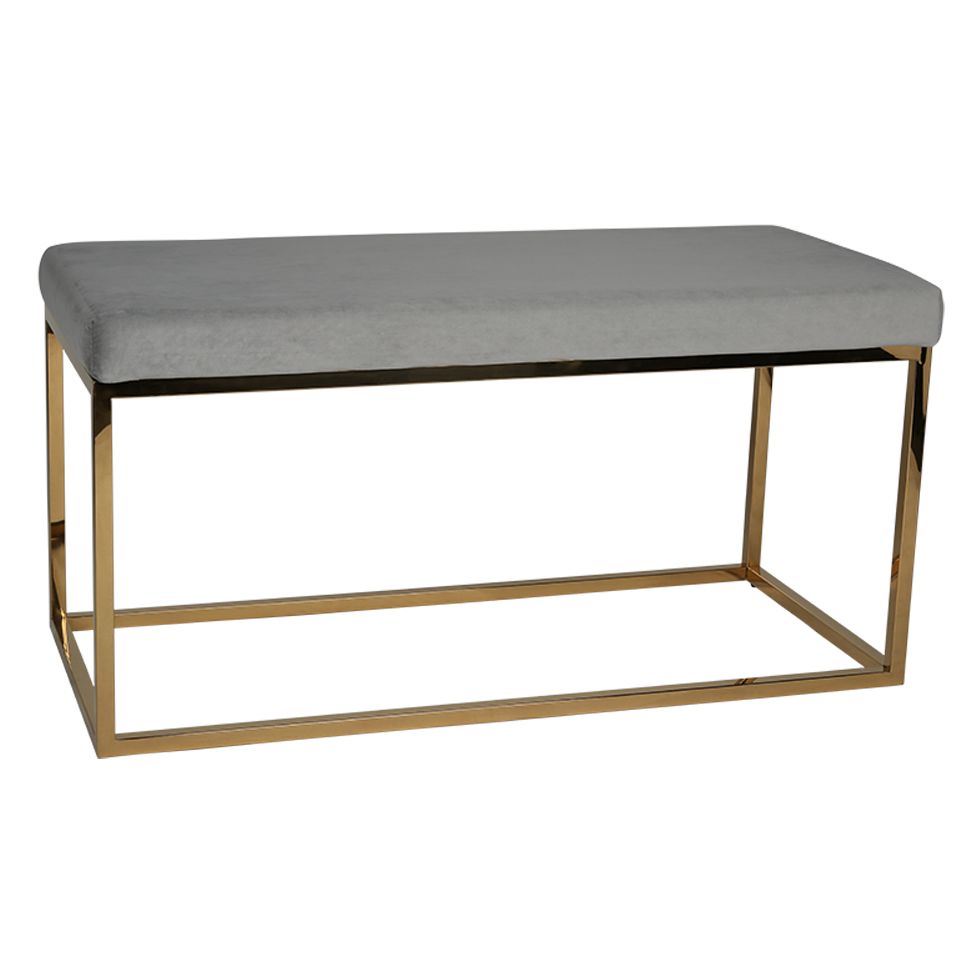Increase your seating possibilities with the Sterling Velveteen Bench. This bench provides an elegant seating option and accommodates two Sterling Stools that nest beneath its seat to conserve space. Featuring a sturdy, tubular metal frame in a gleaming gold metallic finish and plush velveteen upholstery in grey.