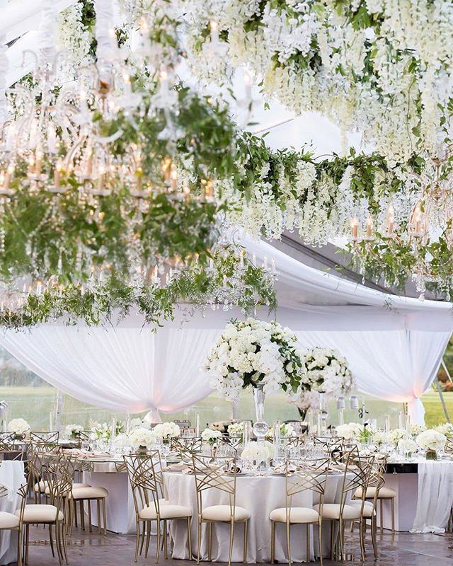 An exquisite reception in white and gold elegantly wrapped in delicate chiffon and adorned with beautiful, lush florals. \u2728 . . . Rentals:...