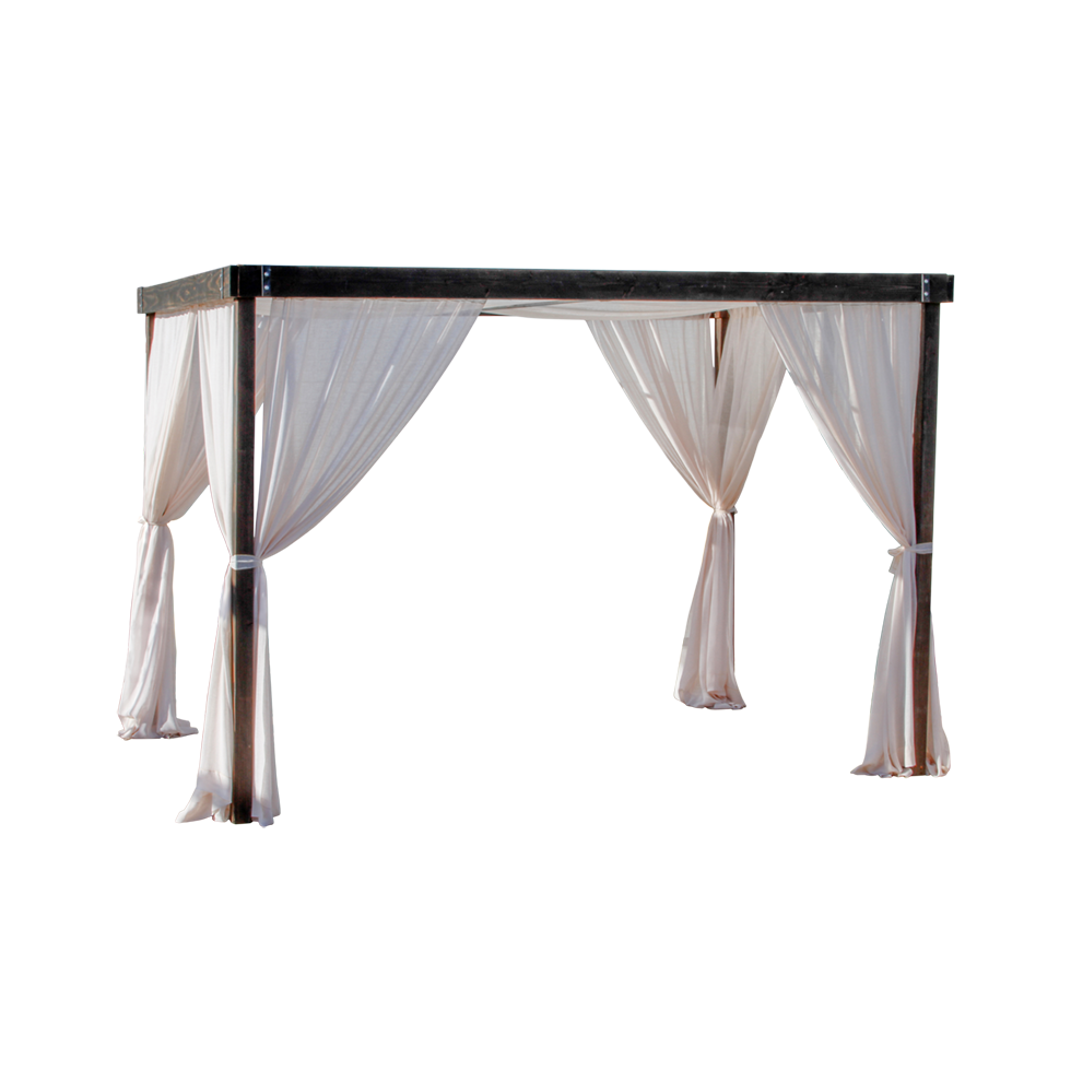 Bring the luxurious feel and a touch of romance to your next event with a cabana. Create a shady sanctuary from the summer sun, join mulitple cabanas together for a perfect outdoor dining space or a lounge area arranged with chaises and comfortable chairs. Available as a stand alone structure you can decorate yourself, or add a draping package for even more romance. Top drapes and leg drapes can be tied back or pulled closed for privacy or to block the sun. We can an array of draping fabric. Contact customer service for additional details.