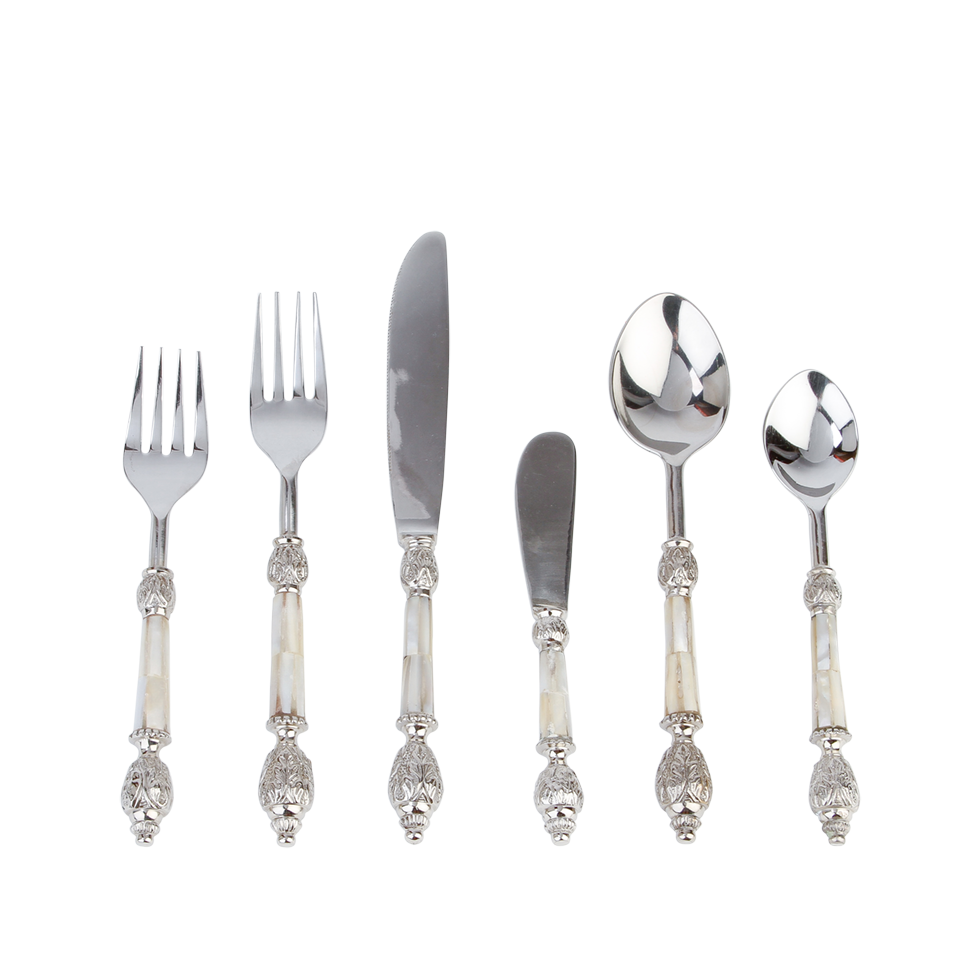 Delicately crafted mother of pearl and an intricately detailed finial on the handle bring a touch of the ocean to your tabletop design.
