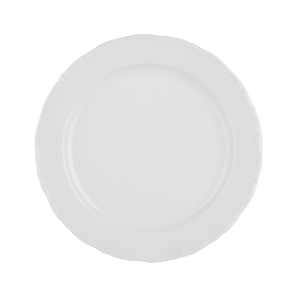 Elegant, white embossed "swirl" pattern covers the border of this upscale dinnerware. A favorite to bring a touch of romance to your next event.