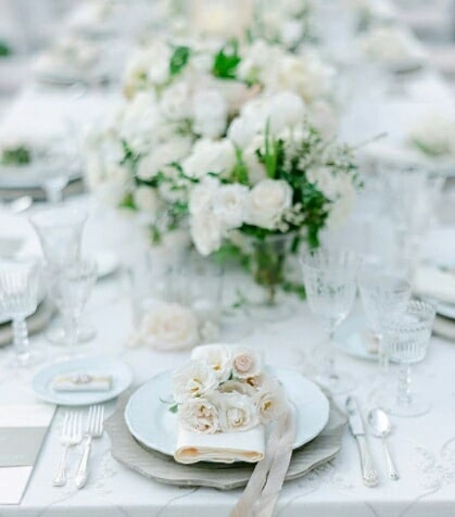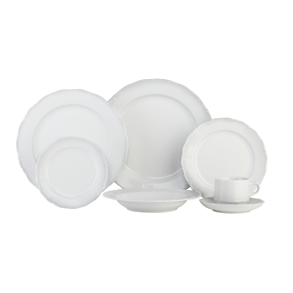 Elegant, white embossed "swirl" pattern covers the border of this upscale dinnerware. A favorite to bring a touch of romance to your next event.