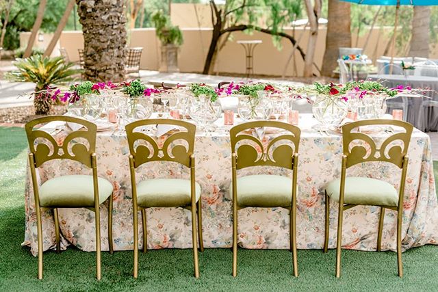 Bold gold paired with romantic pink is a winning combo in our book! Featured here our Chameleon Chairs.