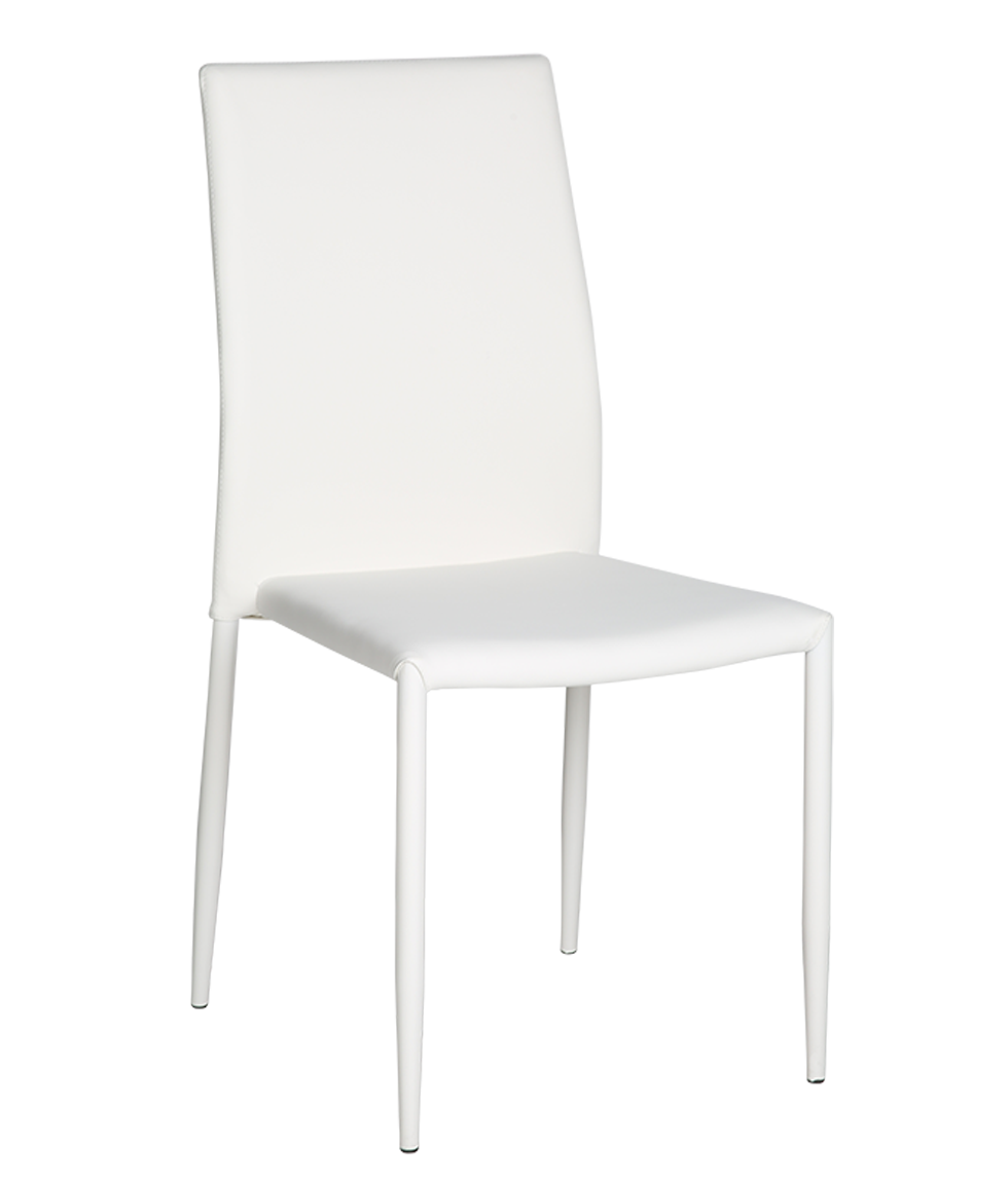 The Davis Chair features a simple silhouette with a lightly padded seat upholstered in white leatherette with white metal legs.