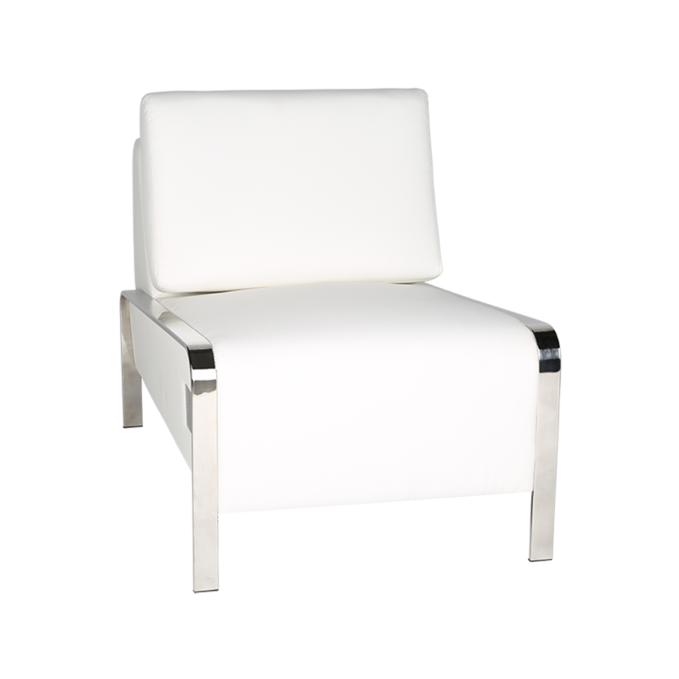 Our Metropolitan side chairs are functional and stylish. Relax and recharge in style surrounded by soft leatherette fabric wrapped around a slim chrome frame. Each side chair houses a charging port on each side with 3 ports for all your charging needs. Available in white or black to coordinate with the matching sofa, side chair or ottoman. All items rented separately.