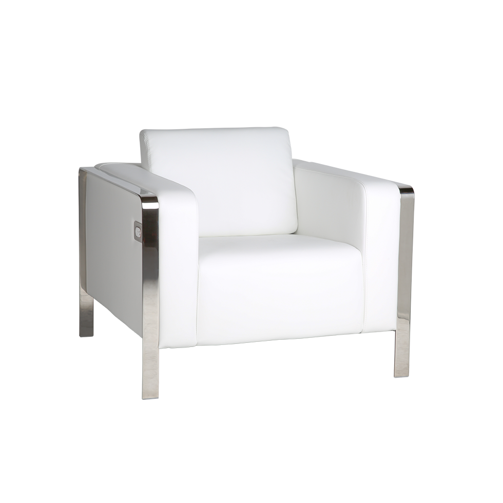 Sink into comfort while recharging your electronics! Our Metropolitan chairs are functional and stylish. Soft leatherette fabric wrapped around a slim chrome frame. Each side chair houses a charging port on each side with 3 ports for all your charging needs. Available in white or black to coordinate with the matching sofa, armless chair or ottoman. All items rented separately.