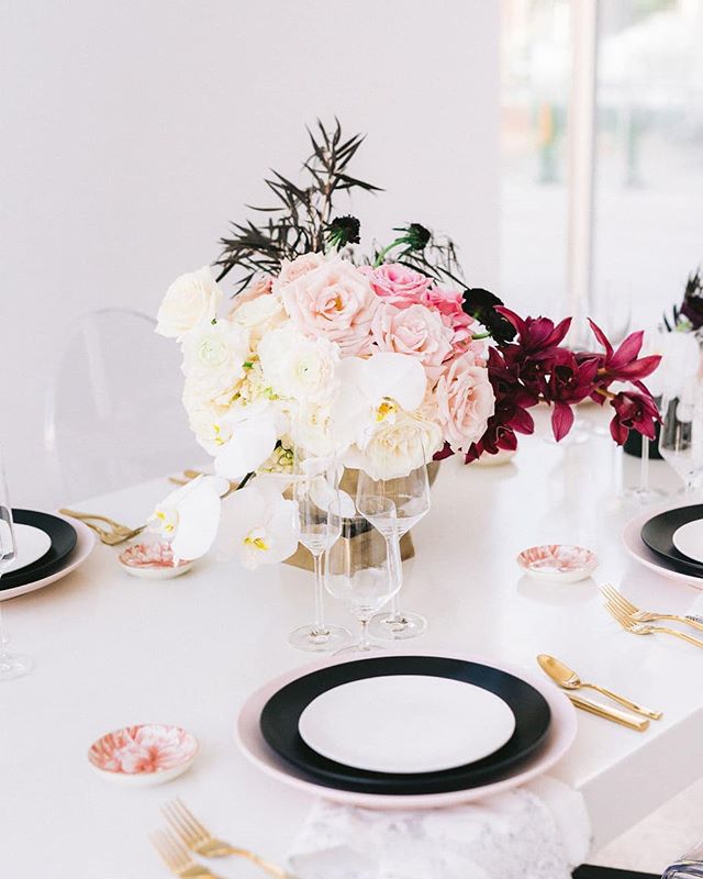 We're starting off the new week with this modern tablescape designed by @konsideritdoneweddings. The black and white combo with a hint of pink and a touch...