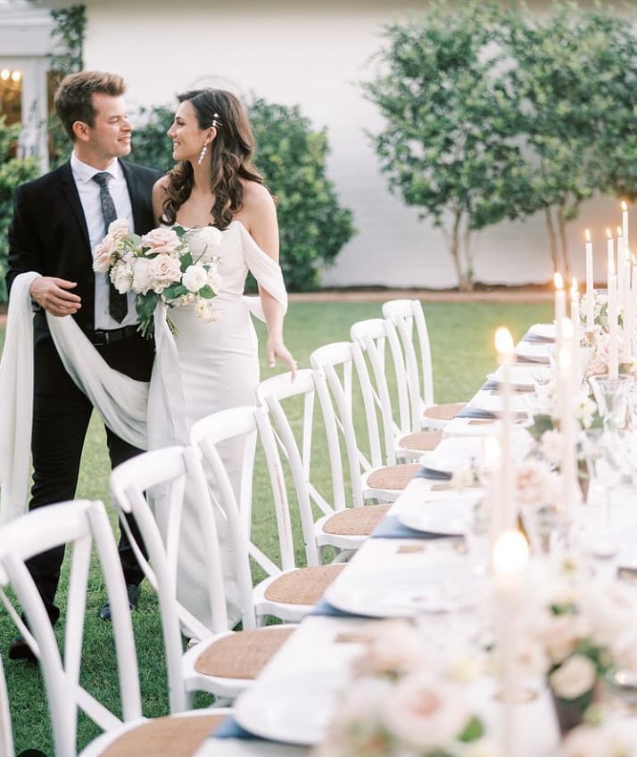 The beautiful moment when the bride and groom view their wedding dinner table before the guests.