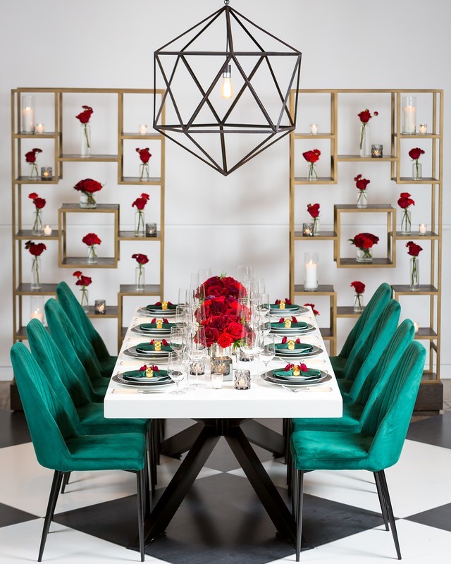 ?Tis the season to be bright and bold! Our White Starburst Table with Black Legs, Emerald Velvet Coco Luxe Side Chair, and Black Metal Polyhedron Chandelier...
