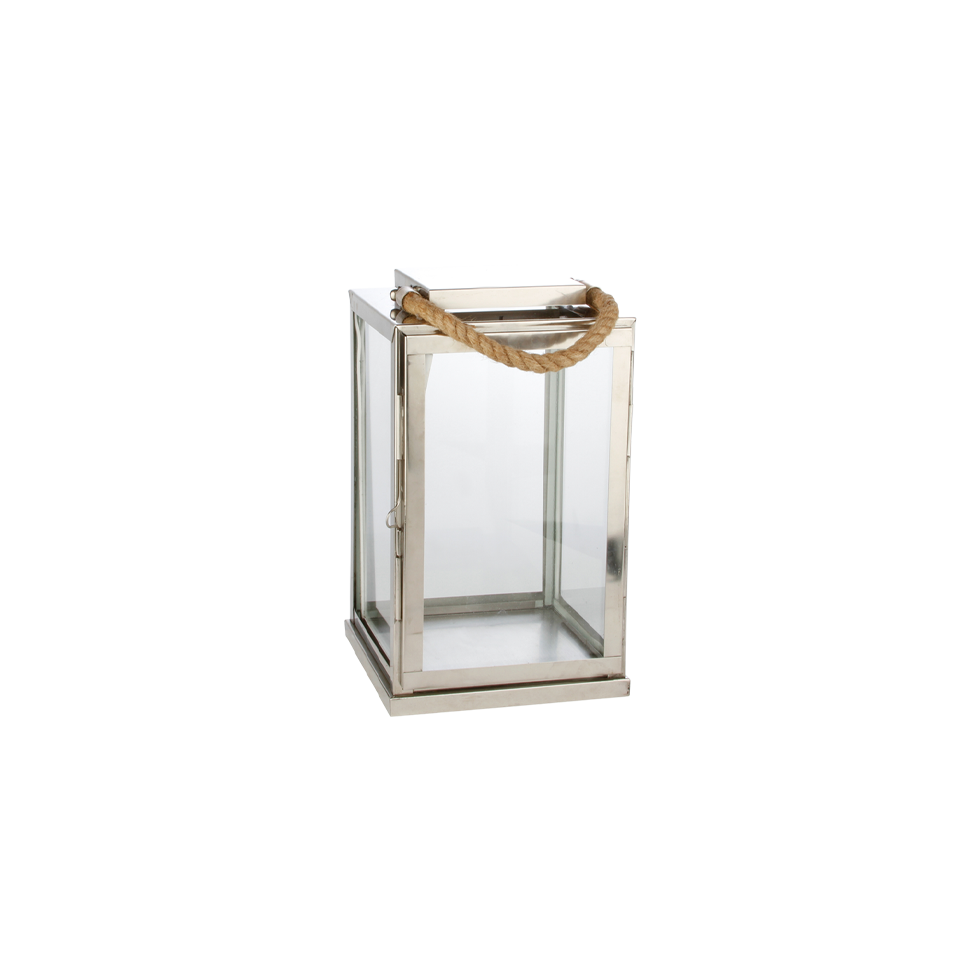 A clean, modern lantern with panes of glass outlined in graceful stainless steel frames that protect pillar candles from breezes and air currents. Accented with a thick rope handle. LED pillar candle, available at an additional fee,